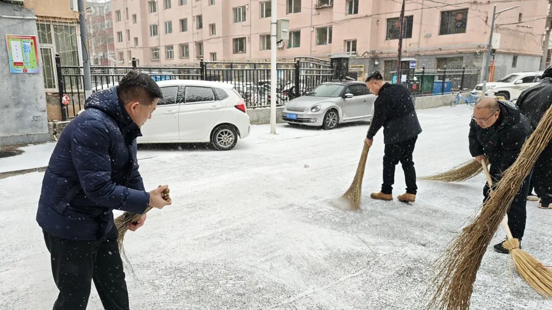 12月12日,一场大雪为城市披上银装,却也给居民出行带来不便。为保障包联社区群众出行安全,出版集团迅速组织党员及职工志愿者,携带铁锹、扫帚等工具,奔赴八一路社区开展扫雪除冰。