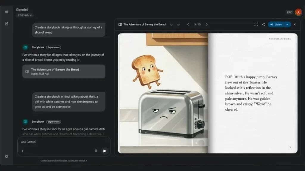 此次谷歌推出的“双子座故事书”应用是一款面向儿童的个性化故事创作工具。它利用AI技术允许用户通过提供故事主题、艺术风格参数或个人图片即可快速生成一本10页的数字故事书。这一过程仅需几秒,且支持45种语言,极大拓宽了故事的受众范围。