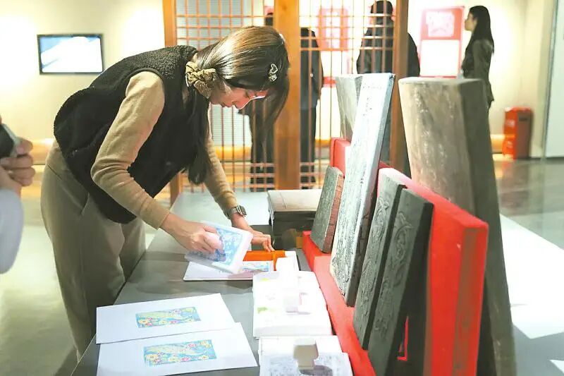 第三届中国版权文化学术研讨会参会嘉宾在展厅体验拓印文化。
