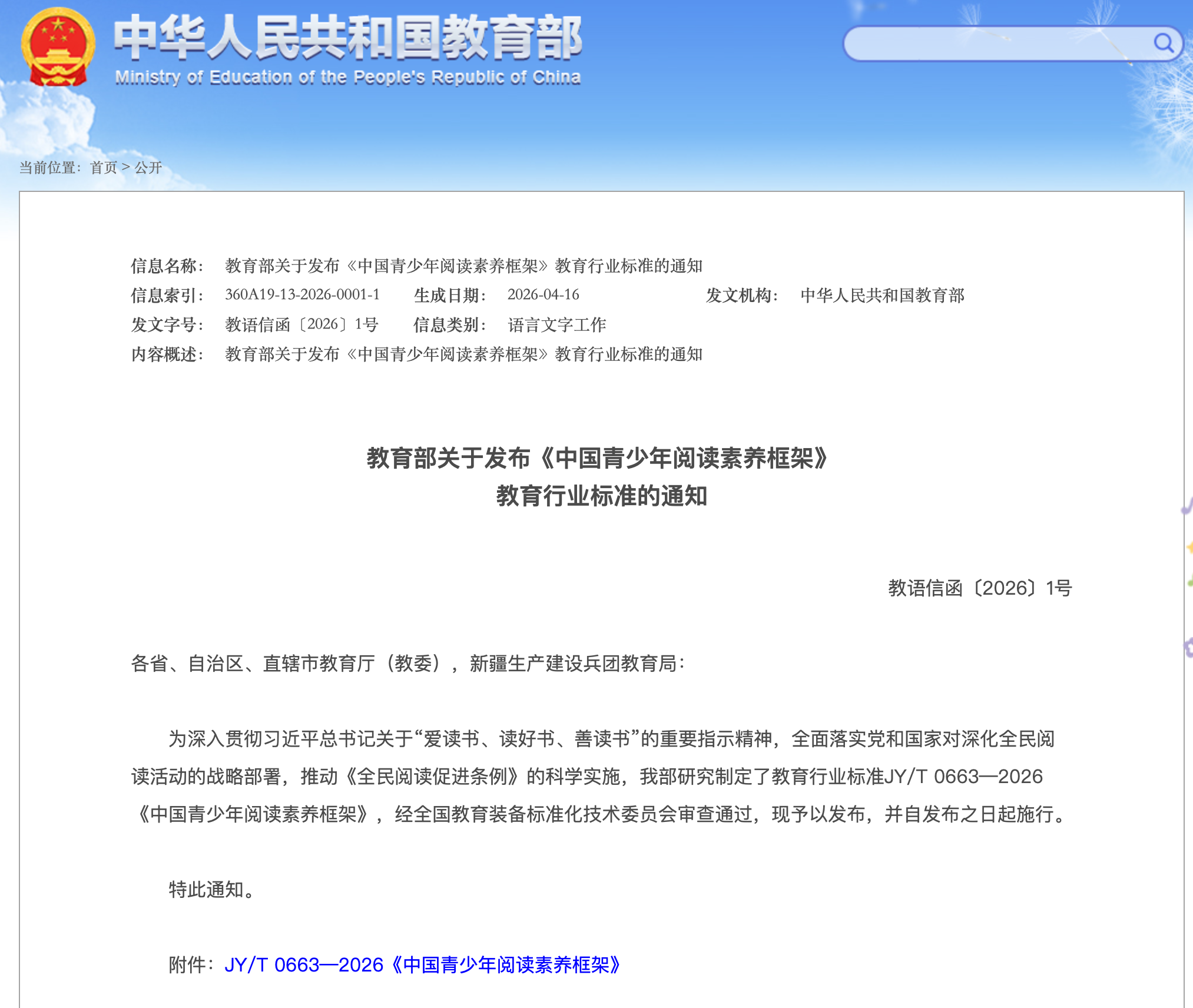4月15日,教育部发布《中国青少年阅读素养框架》教育行业标准。该标准由北京师范大学协同相关单位共同研制,经全国教育装备标准化技术委员会审定通过,自发布之日起实施。